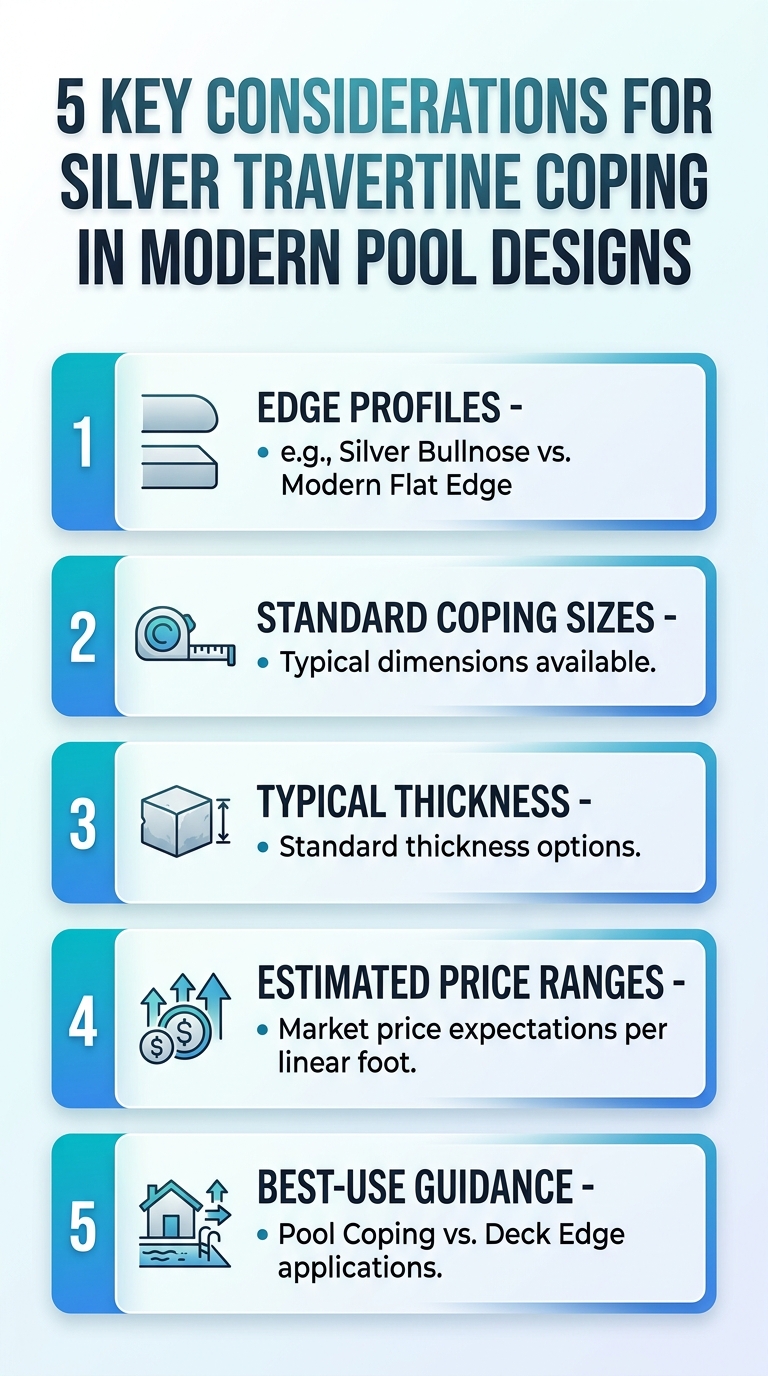 A quick visual guide to silver travertine coping for contemporary pools. It highlights durability, color, slip resistance, maintenance, and installation considerations.